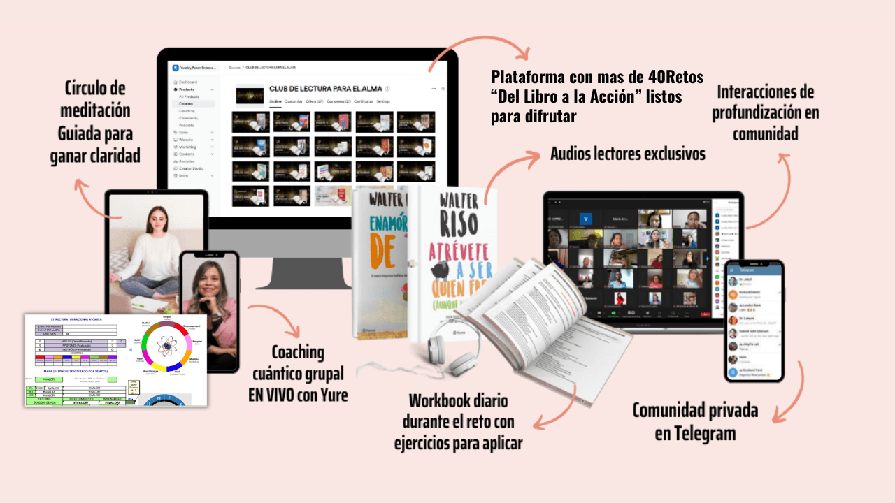 Cada mes, mujeres de toda Latinoamérica leen, reflexionan y aplican las enseñanzas de un libro poderoso con propósito, coaching cuántico y comunidad consciente.